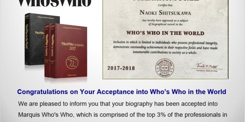 【速報】世界最高の紳士録 Marquis Who’s Who in the worldに今年も弊社が選出されました。